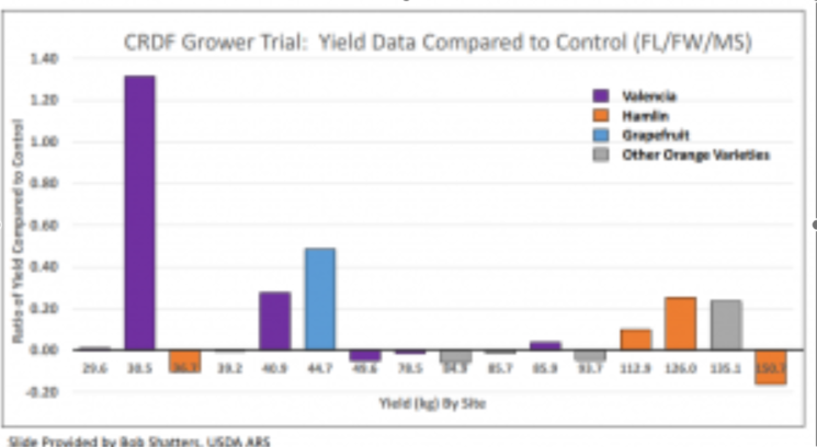 The August 2017 trial by the CRDF, which treated over 131,000 acres with MycoShield, FireLine, and FireWall products, concluded that “multiple years” were required before the hoped-for results could be shown. In the publicly available trial summary, “CRDF Bactericide Field Trial Update” presented at the Citrus Expo on August 17, 2017, 8 out of 16 trial sites actually experienced decreases in fruit yield compared to untreated trees:
